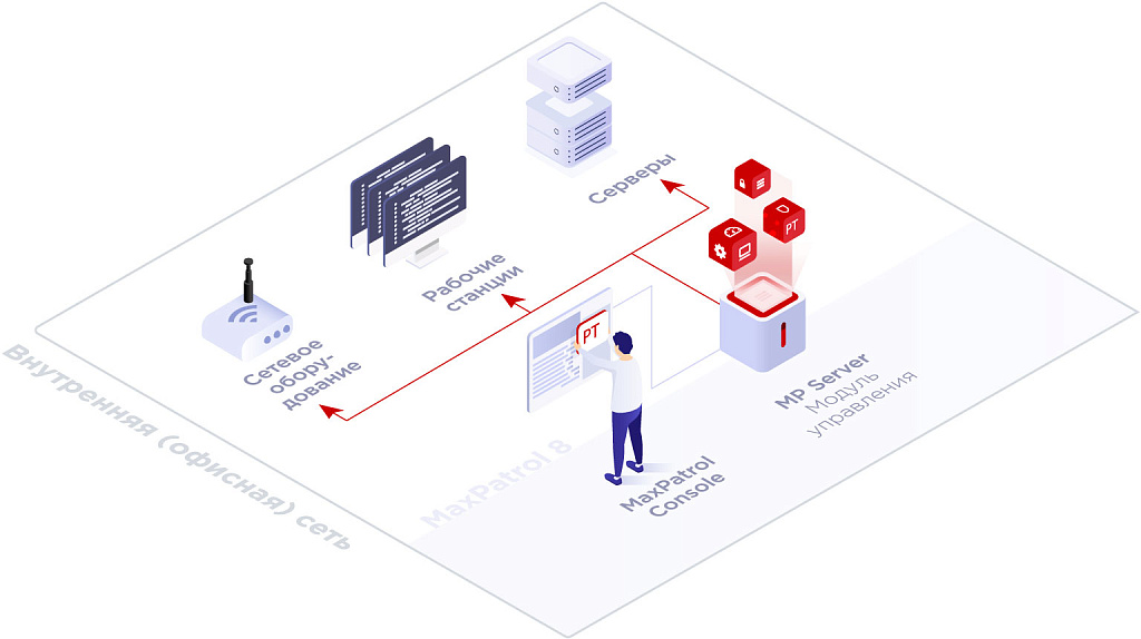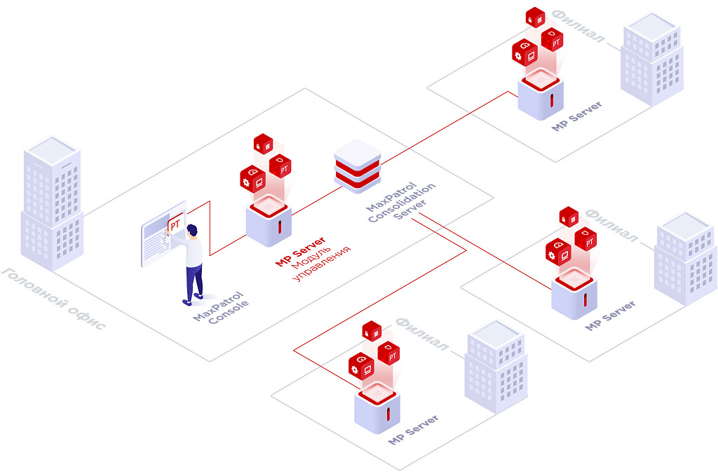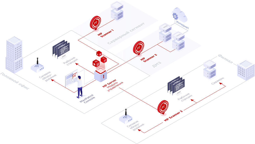 Система для небольшой корпоративной сетиДля небольшого офиса достаточно одного сервера MP Server со встроенным сканером и консолью управления. Это минимальный вариант развертывания MaxPatrol 8. ![]() Система для крупной структурированной сетиАрхитектура MaxPatrol 8 позволяет подключить несколько сканеров для работы в сетях среднего размера. Дополнительные сканеры помогут: