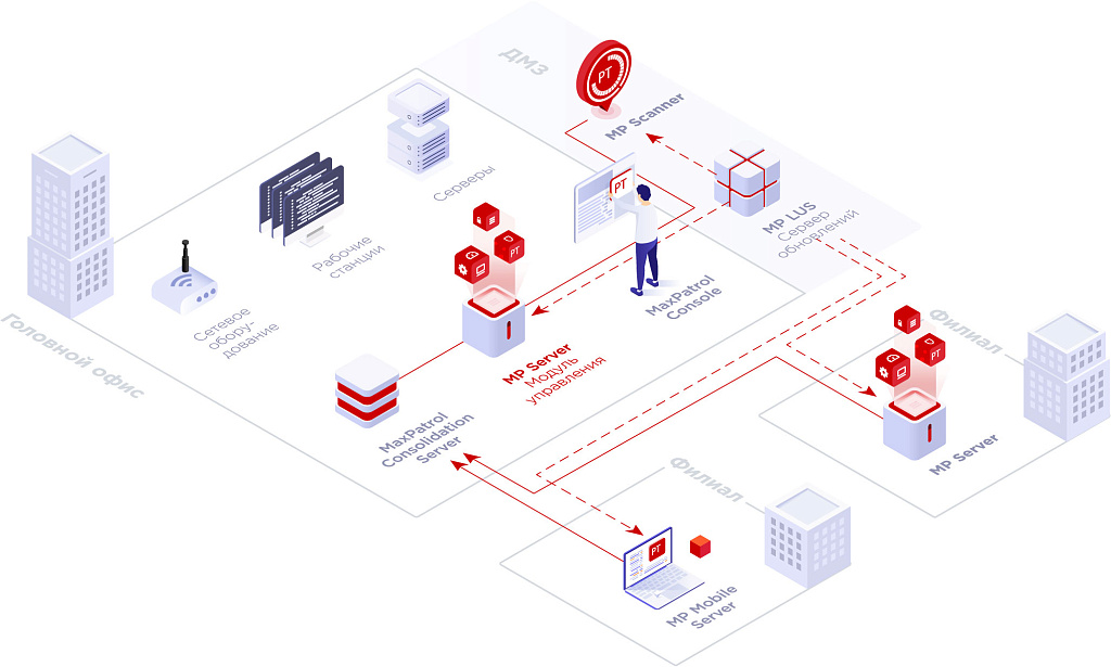 MaxPatrol 8 в Едином реестре российских программ для ЭВМ и баз данных. MaxPatrol 8 также сертифицирован для использования на территории республики Беларусь и республики Казахстан. Архитектура продукта![]() Архитектура MaxPatrol 8 обеспечивает гибкое масштабирование и позволяет внедрять систему в компаниях любого размера: можно подобрать MaxPatrol 8 под свою инфраструктуру — выбрать количество серверов, сканеров, режимы сканирования. Ядро системы — MP Server. Это модуль управления, позволяющий регулировать конфигурацию и настройку системы. В него входит сканер MP Scanner, который сканирует, собирает и обрабатывает данные. При необходимости к MP Server можно подключить дополнительные сканирующие модули. Это позволит увеличить скорость сканирования и учитывать нюансы топологии сети. В крупных распределенных информационных системах применяется сервер консолидации MaxPatrol Consolidation Server. Он позволяет собрать информацию с различных серверов MP Server и получить комплексную оценку защищенности всей IT-инфраструктуры. Локальный сервер обновлений MaxPatrol Local Update Server (LUS) используется как единая точка поддержки базы знаний, которая содержит информацию о проверках, уязвимостях и стандартах. Также существует специализированная версия MP Server для работы на мобильных компьютерах — MaxPatrol Mobile Server.