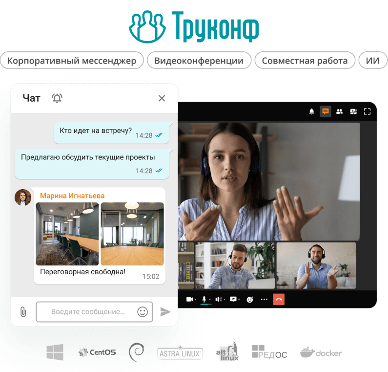 Труконф объединяет рабочие места и мобильные устройства сотрудников, а также переговорные комнаты с помощью защищённой видеосвязи и удобного набора инструментов для совместной работы.